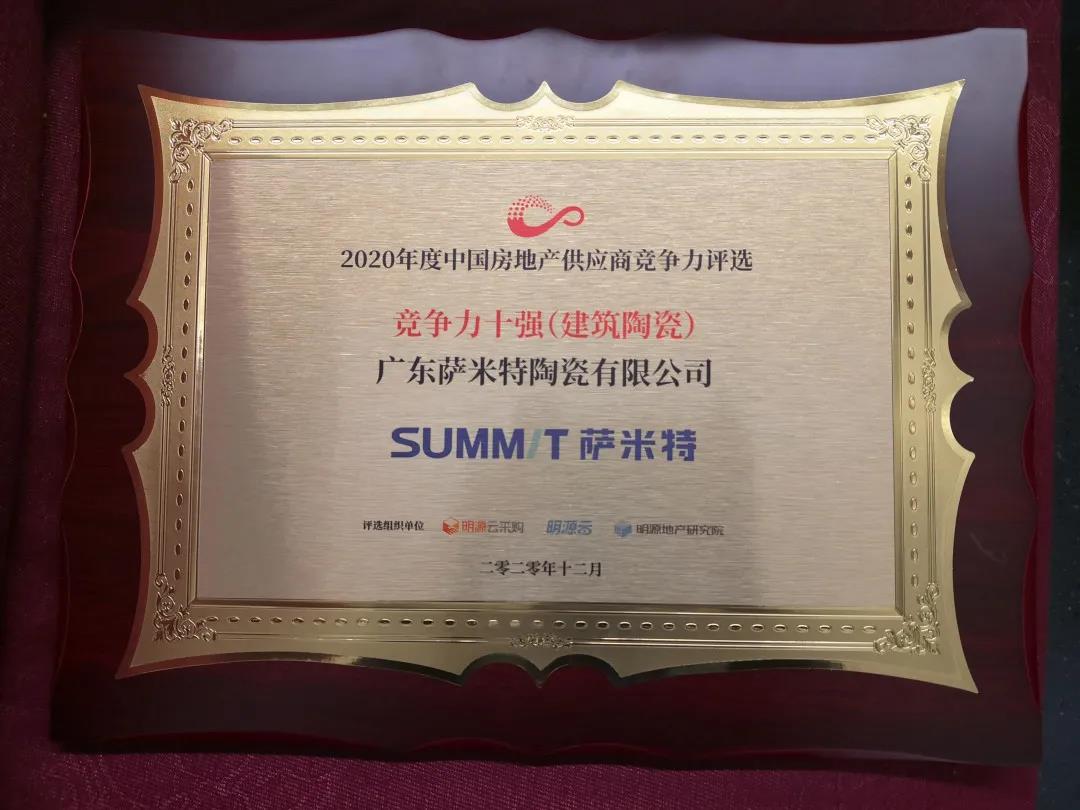12月11日, 由明源云攜手中城聯(lián)采共同舉辦的“采購(gòu)新價(jià)值,共筑新人居”2020中國(guó)房地產(chǎn)年度采購(gòu)峰會(huì)暨精選供應(yīng)商創(chuàng)新成果展在上海國(guó)家會(huì)展中心召開(kāi),在大會(huì)舉辦的2020年度中國(guó)房地產(chǎn)供應(yīng)商競(jìng)爭(zhēng)力評(píng)選中,新明珠集團(tuán)旗下薩米特瓷磚品牌從眾多實(shí)力強(qiáng)大的競(jìng)爭(zhēng)品牌中脫穎而出,榮獲“2020年度中國(guó)房地產(chǎn)建筑陶瓷供應(yīng)商競(jìng)爭(zhēng)力十強(qiáng)”稱號(hào)。