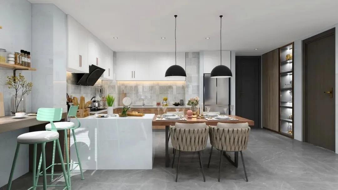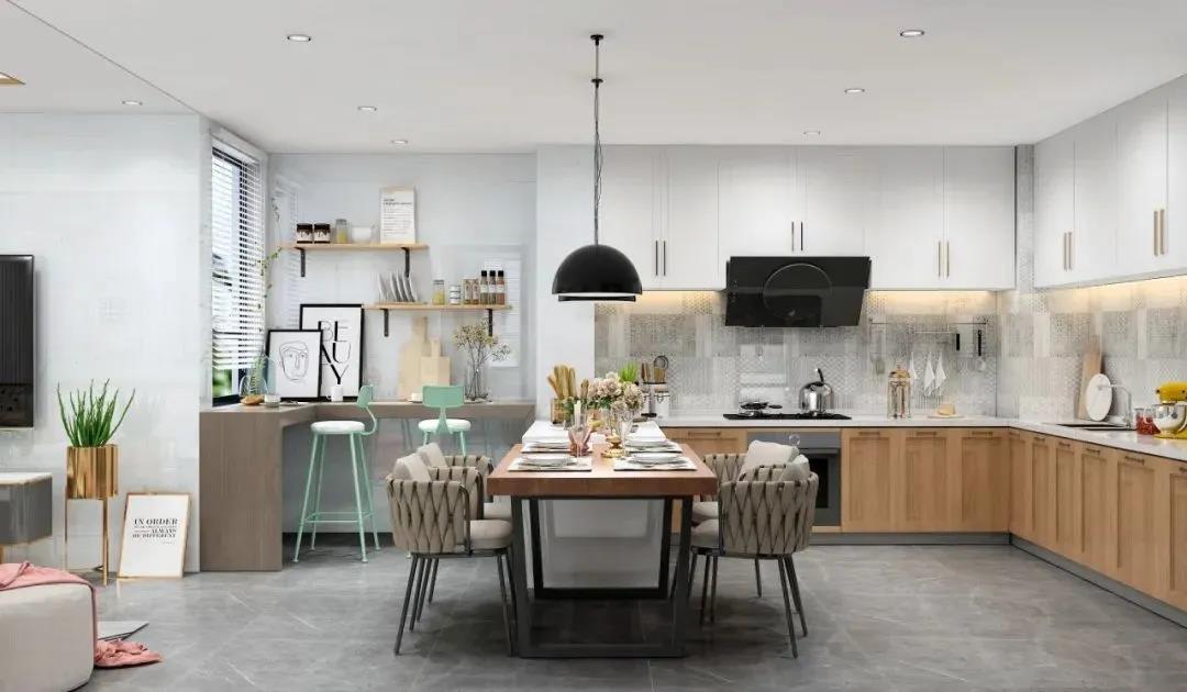 島臺旁邊延伸出來便是木飾面餐桌,這種設計參考了歐美流行的做法,一方面充分利用每一寸的空間,另一方面增加各空間的互動性。可以邊欣賞廚房的景色,邊來一口香氣撲鼻的美食或美酒,既溫馨且有情調。