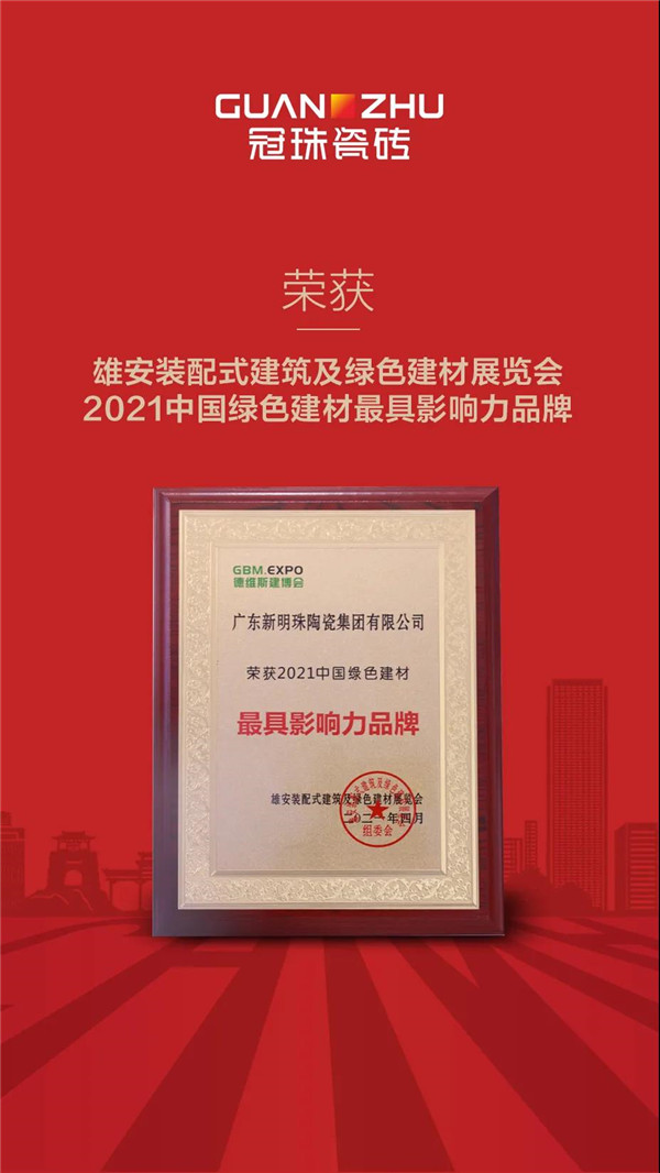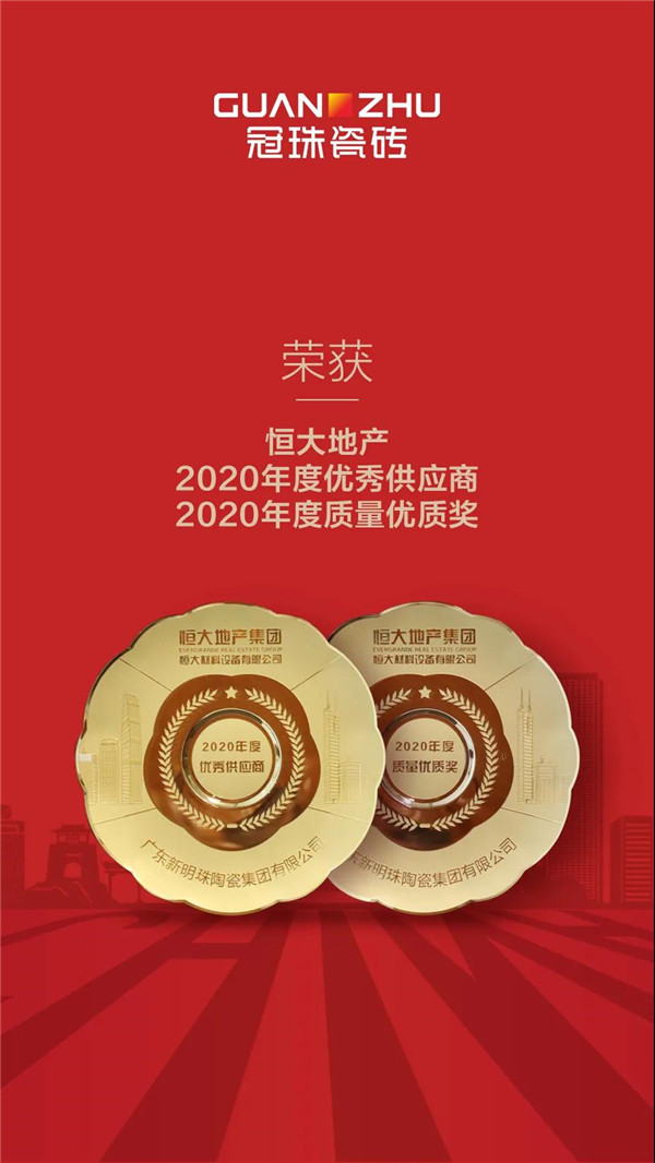 憑借領跑同行的品質產品和服務體系,冠珠瓷磚(廣東新明珠陶瓷集團有限公司)從數百家供應商中脫穎而出,榮獲恒大地產“2020年度優秀供應商”、“2020年度質量優質獎”雙項大獎。同時,昨天舉行的第五屆雄安城市建設暨裝配式建筑創新發展論壇上,冠珠瓷磚(廣東新明珠陶瓷集團有限公司)在綠色建筑領域的成績再獲認可,獲評“2021中國綠色建材最具影響力品牌”!