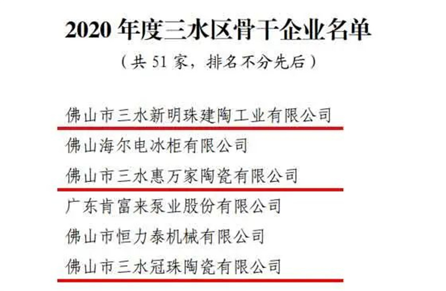 近日,佛山市三水區(qū)人民政府發(fā)布了2020 年度三水區(qū)骨干企業(yè)名單,其中,新明珠陶瓷集團(tuán)旗下佛山市三水新明珠建陶工業(yè)有限公司、佛山市三水冠珠陶瓷有限公司、佛山市三水惠萬家陶瓷有限公司均位列榜單,強(qiáng)勢霸榜。