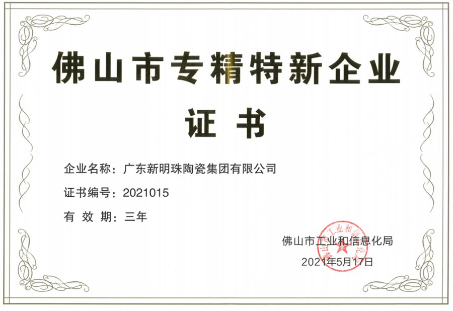 5月26日,由佛山市工業(yè)和信息化局舉辦的2021 年戰(zhàn)略性產(chǎn)業(yè)集群融資服務(wù)對(duì)接活動(dòng)(專(zhuān)精特新企業(yè)專(zhuān)場(chǎng))在佛山市禪城區(qū)希爾頓酒店舉行,會(huì)上為佛山市專(zhuān)精特新企業(yè)頒發(fā)了證書(shū)。新明珠陶瓷集團(tuán)憑借突出的創(chuàng)新力和強(qiáng)大的綜合實(shí)力,榮獲“佛山市專(zhuān)精特新企業(yè)”證書(shū)。