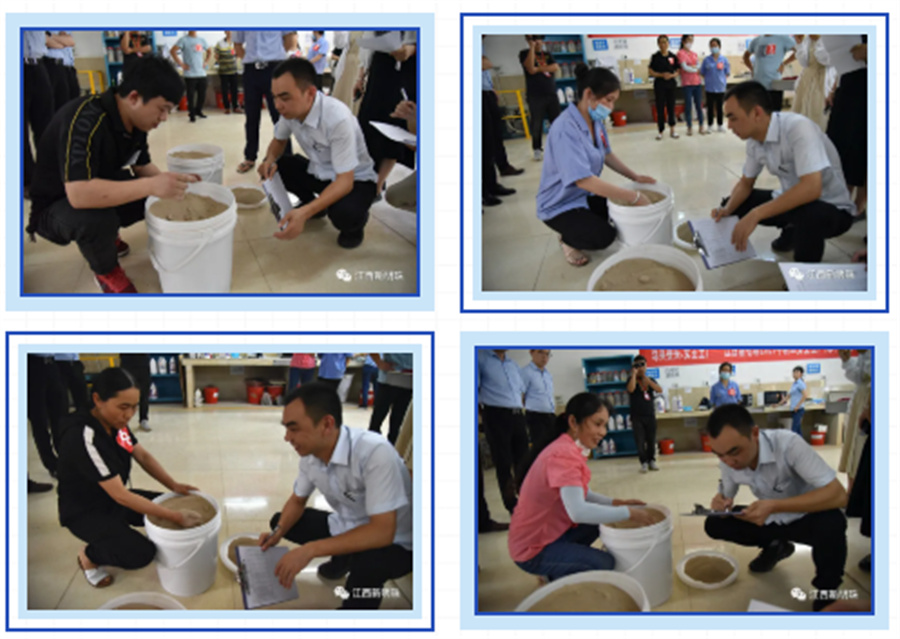 把膠粉料攪拌均勻后先取300克樣裝入密封袋待用,桶內(nèi)剩余的粉料由參賽選手依次通過(guò)用手反復(fù)抓握粉料成團(tuán)結(jié)塊和目測(cè)兩種方式來(lái)判定粉料的含水率,在30秒內(nèi)報(bào)出數(shù)值,數(shù)值精確到小數(shù)點(diǎn)后一位數(shù)。完成之后由工藝質(zhì)檢員取提前留好的樣用機(jī)測(cè)出實(shí)際粉料含水率,估測(cè)值與實(shí)測(cè)值差值最小值獲勝。