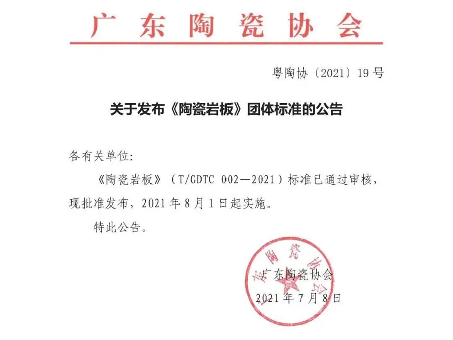 近日,由廣東陶瓷協會牽頭組織,廣東新明珠陶瓷集團等50多家單位參與編寫的《陶瓷巖板》(T/GDTC 002-2021)團體標準經審查、批準,于2021年7月8日正式發布,自2021年8月1日起實施。
