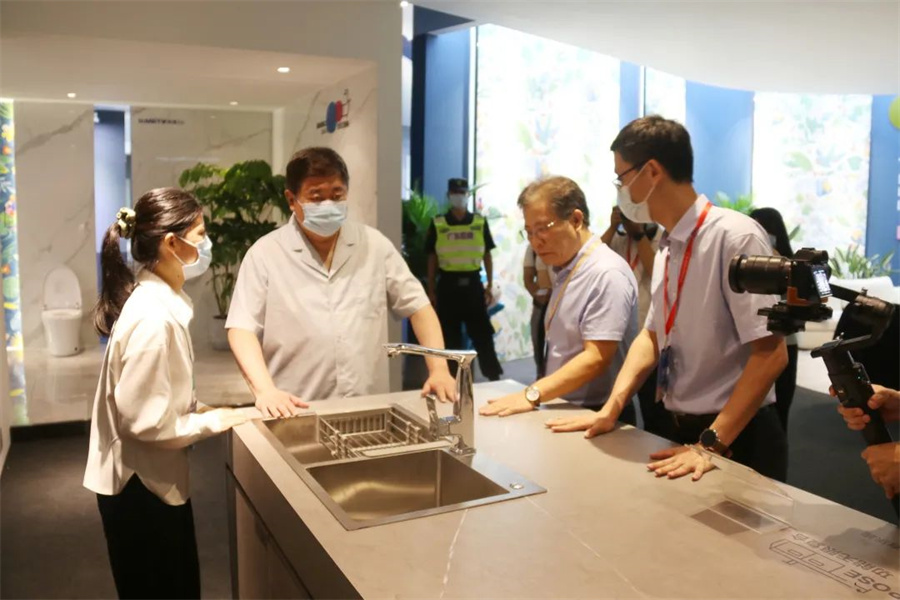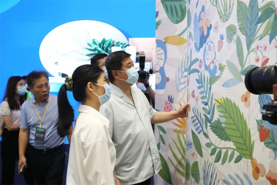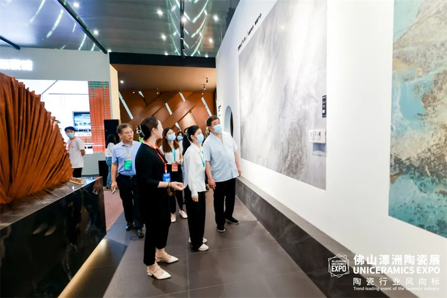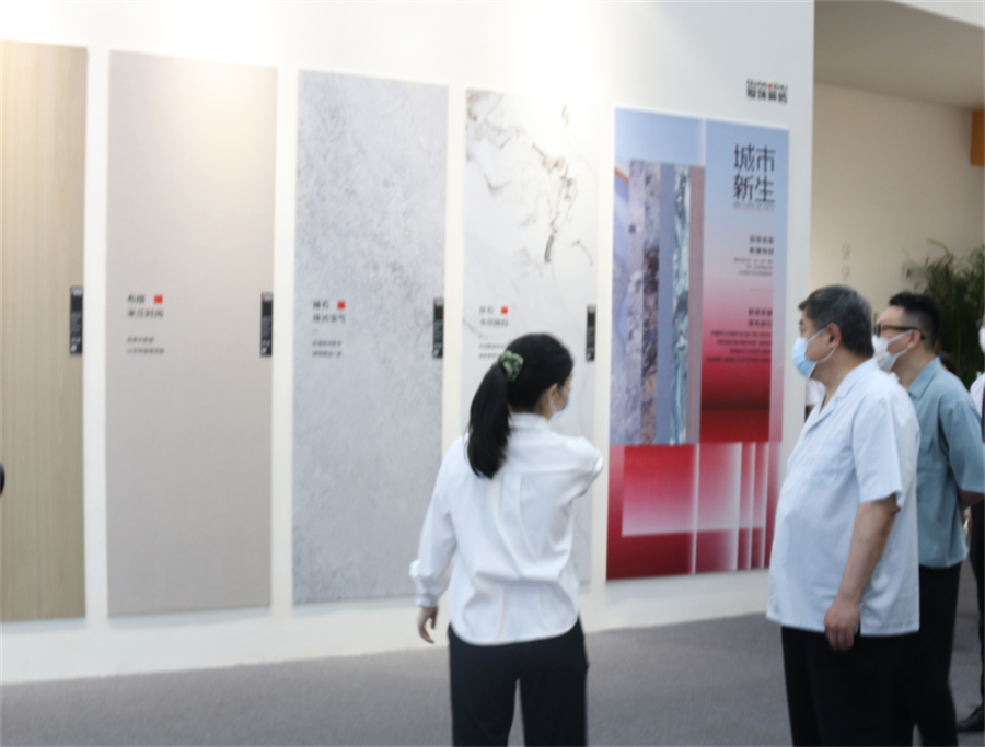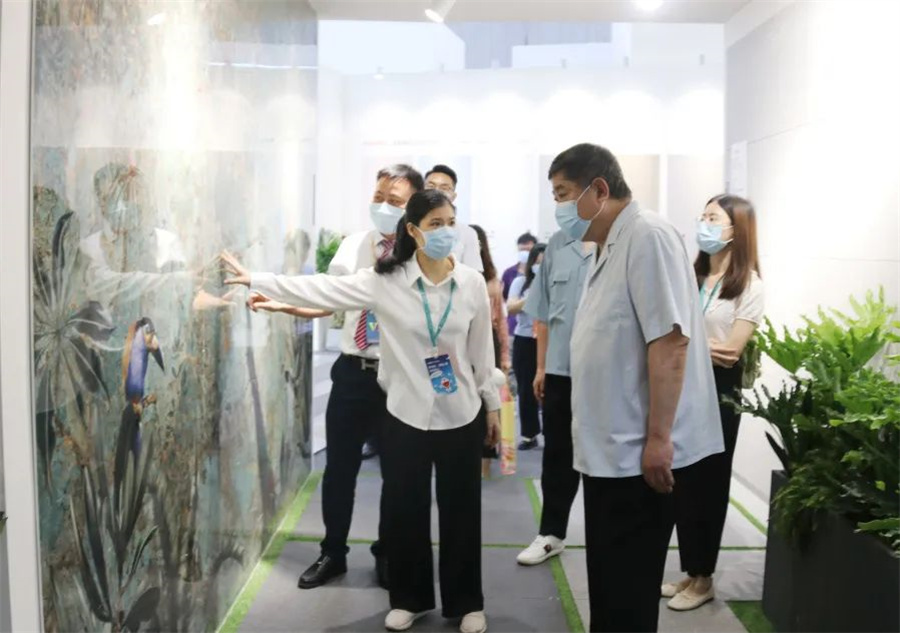 在冠珠展位,單霽翔院長對冠珠展示的2700×1200mm花鳥藝術背景墻表現出了濃厚的興趣。在薩米特展位,單霽翔院長向工作人員了解了薩米特與哆啦A夢合作推出的聯名產品,還親自用手感受產品質感。在格萊斯展位,單霽翔院長對格萊斯以佛山傳統織物香云紗為原型研發的香云紗瓷磚3.0大為贊賞,他驚喜地發現,原來瓷磚也可以融入文化元素,成為傳承中國傳統文化的載體。