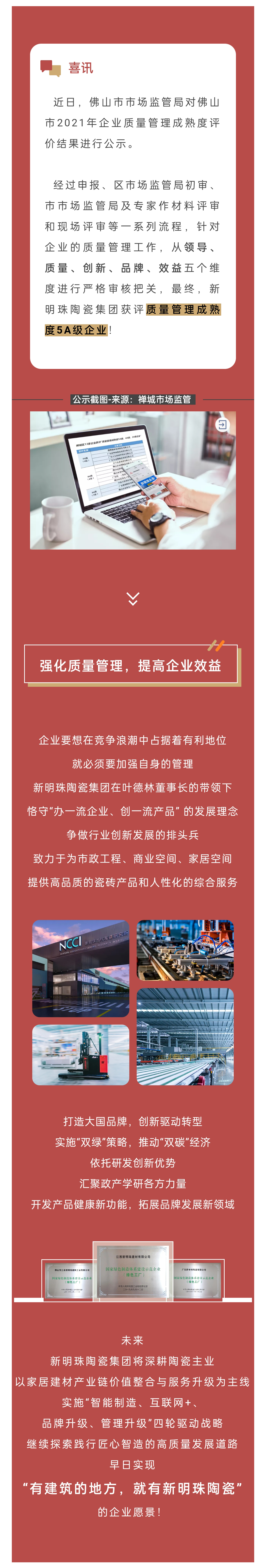 喜訊|新明珠陶瓷集團獲評質量管理成熟度5A級企業