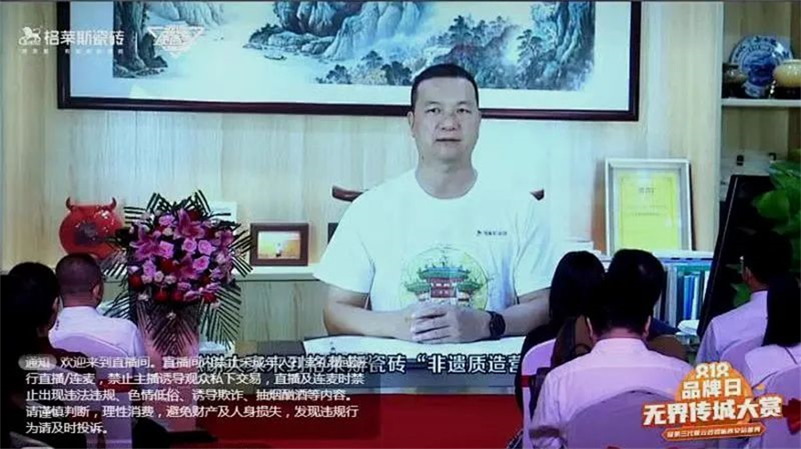 在直播盛典上,陜西星宏置業有限公司、西安格萊斯瓷磚總經理郭俊奇致辭。他坦言,2003年,陜西星宏建材家居公司成為格萊斯品牌西安經銷商,多年來公司團隊通過周到的服務不斷獲得了消費者的支持與信任,也讓格萊斯品牌發展成為陜西人民最喜愛和最信任的建材家居品牌之一。通過展廳云逛展,相信大家對格萊斯品牌和產品有更深入的了解,體驗到文化傳承背后的品牌用心。
