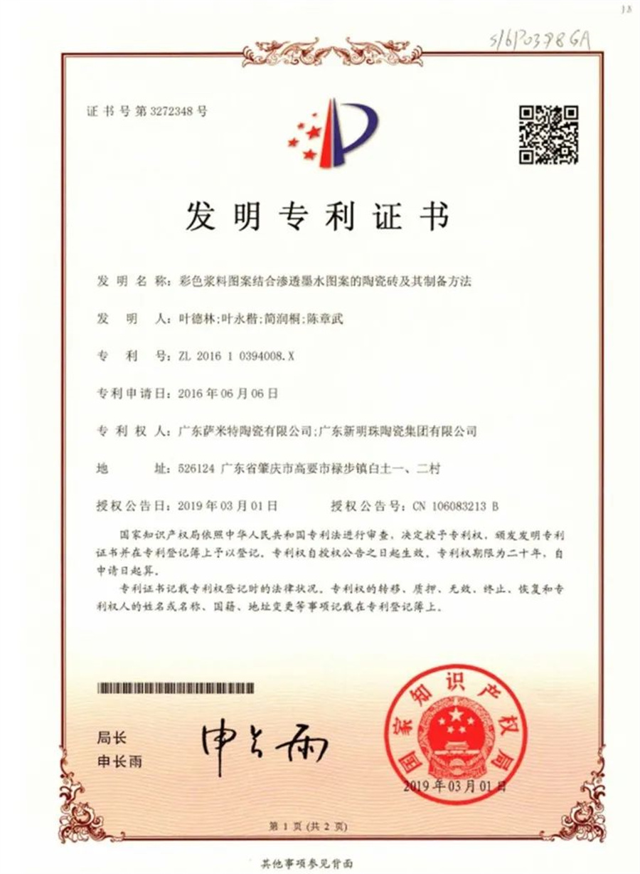 歷經嚴格審查,「彩妝」系列巖板由國家知識產權局授予的專利產權,并頒發【發明專利】證書。同時,今年7月經鑒定委員會審議,“大規格彩色瓷面陶瓷巖板的研制及產業化”達國際領先水平。