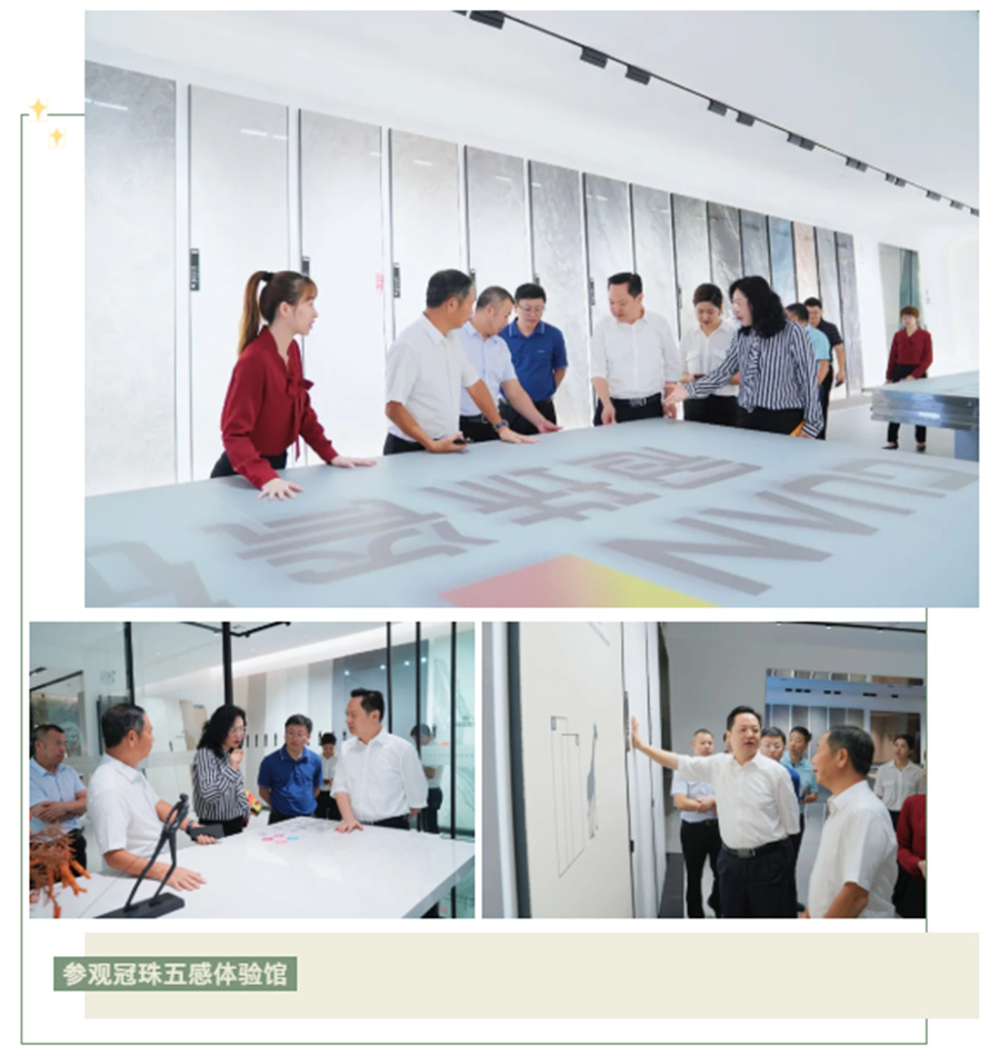 在晨曦的第一縷陽光中,葉德林董事長帶領高安市政府領導一行首先參觀了新明珠集團旗下冠珠品牌的五感體驗館。到場眾領導對石墨烯智暖芯瓷磚產生極大興趣,當了解到這款瓷磚具有節能環保、快速升溫、遠程智能調控等特性時,不禁連連點贊。