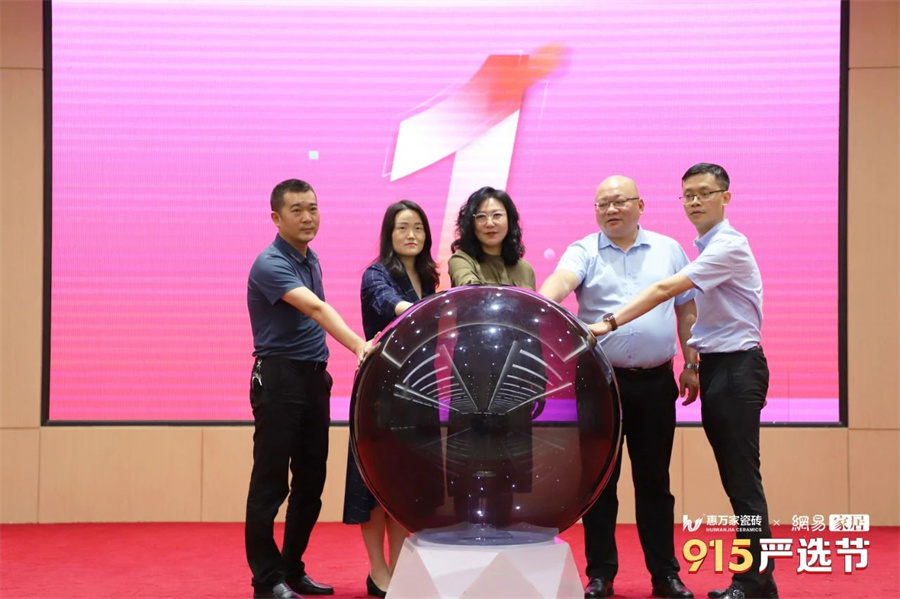 會上,由新明珠集團高總 、網易家居鄭哲女士、惠萬家品牌龐總、市場二部招總及南海惠萬家楊總,共同按下啟動鍵,正式啟動惠萬家瓷磚915嚴選節。