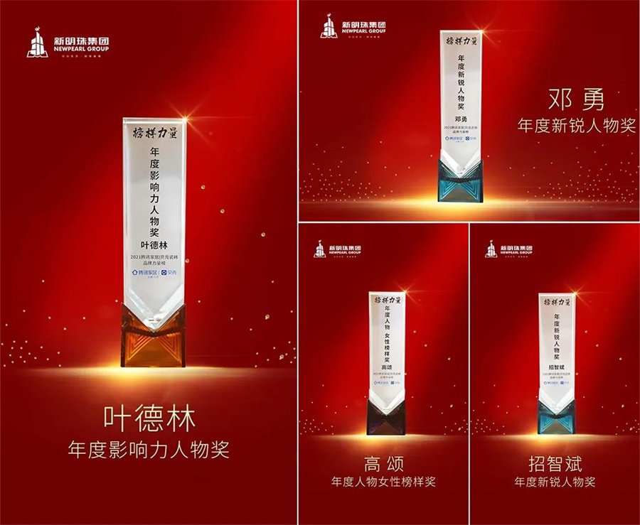 行業(yè)有榜樣,前進有力量。會上,新明珠集團股份有限公司董事長葉德林榮獲“年度影響力人物獎”;集團副總裁鄧勇榮獲“年度新銳人物獎”;集團副總經(jīng)理高頌榮獲“年度人物女性榜樣獎”;市場二部總監(jiān)招智斌榮獲“年度新銳人物獎”。