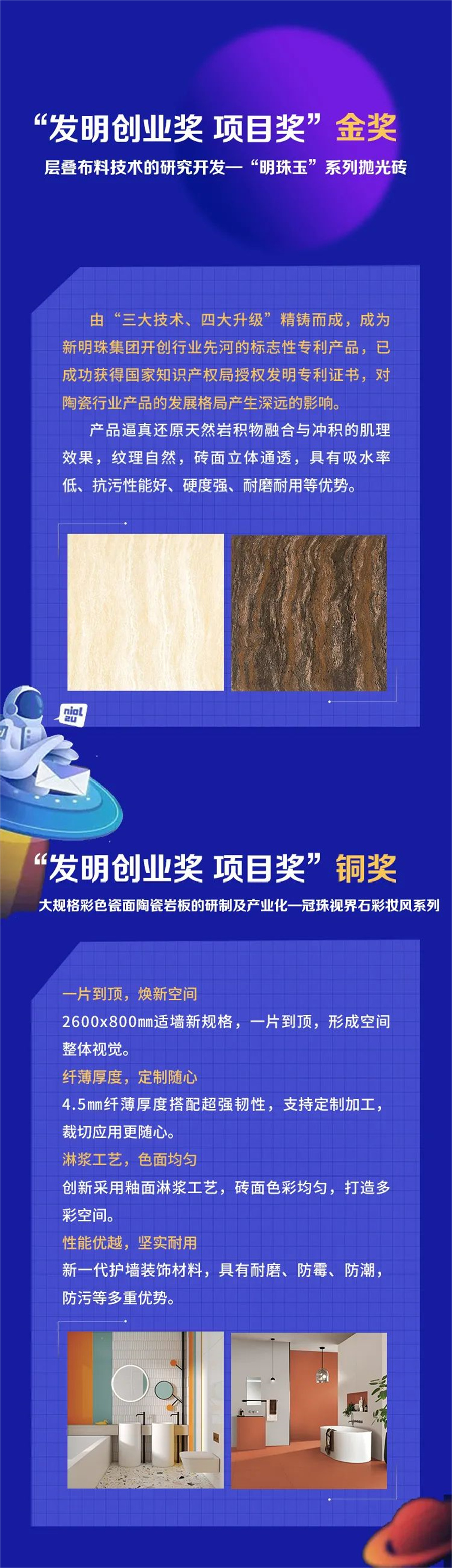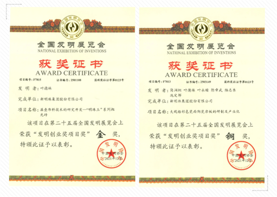 新明珠集團攜多項創新成果C位亮相全國發明展,其中,“層疊布料技術的研究開發——‘明珠玉’系列拋光磚”榮獲“發明創業獎項目獎”金獎, “大規格彩色瓷面陶瓷巖板的研制及產業化”榮獲銅獎,深受權威機構和市場的高度認可。