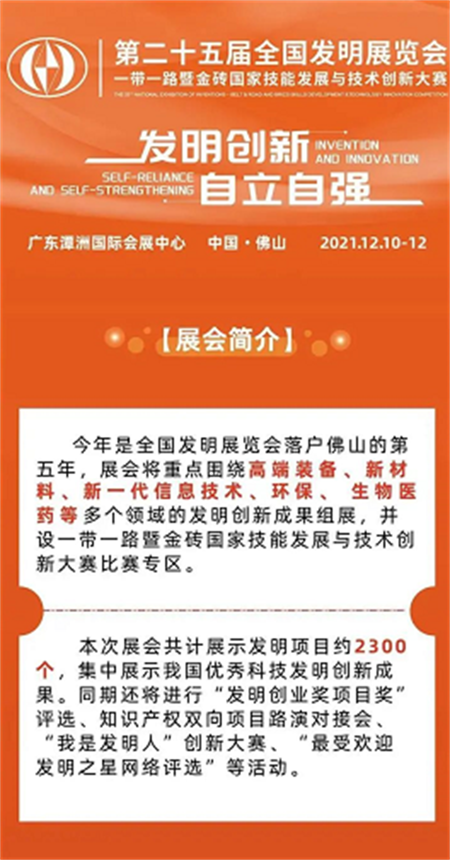 12月10日至12日,由中國發明協會、金磚國家工商理事會、廣東省科技廳、廣東省科協主辦,佛山市人民政府承辦的第二十五屆全國發明展覽會一帶一路暨金磚國家技能發展與技術創新大賽(以下稱“全國發明展”)在廣東省佛山市潭洲國際會展中心舉辦。