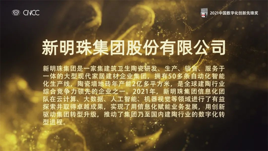 為了表彰在過去一年里為數字化做出貢獻的優秀企業,此次峰會頒發了“2021中國數字化創新先鋒獎”, 新明珠集團股份有限公司榮獲該獎項。