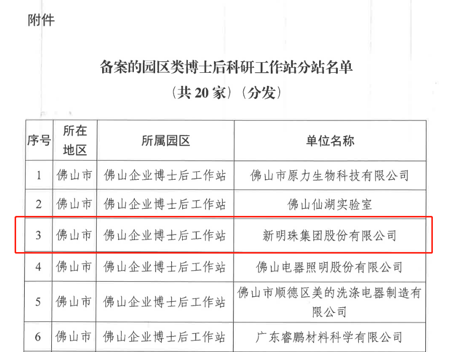 近日,廣東省人力資源和社會保障廳辦公室下發《關于同意中新廣州知識城管理委員會博士后科研工作站廣州大學黃埔研究院分站等20家分站備案的通知》,新明珠集團股份有限公司成功獲批設立博士后科研工作站,今后可獨立開展博士后人才招收培養工作。