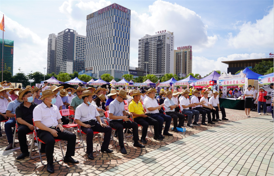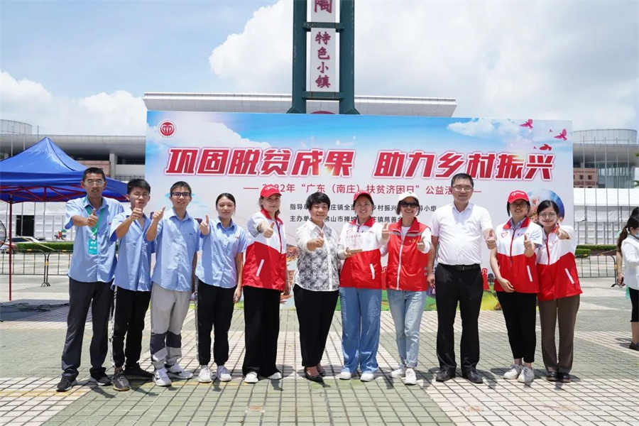 南莊鎮(zhèn)副鎮(zhèn)長(zhǎng)羅艷明、鎮(zhèn)農(nóng)業(yè)農(nóng)村辦公室主任潘漢基與新明珠集團(tuán)志愿者合影