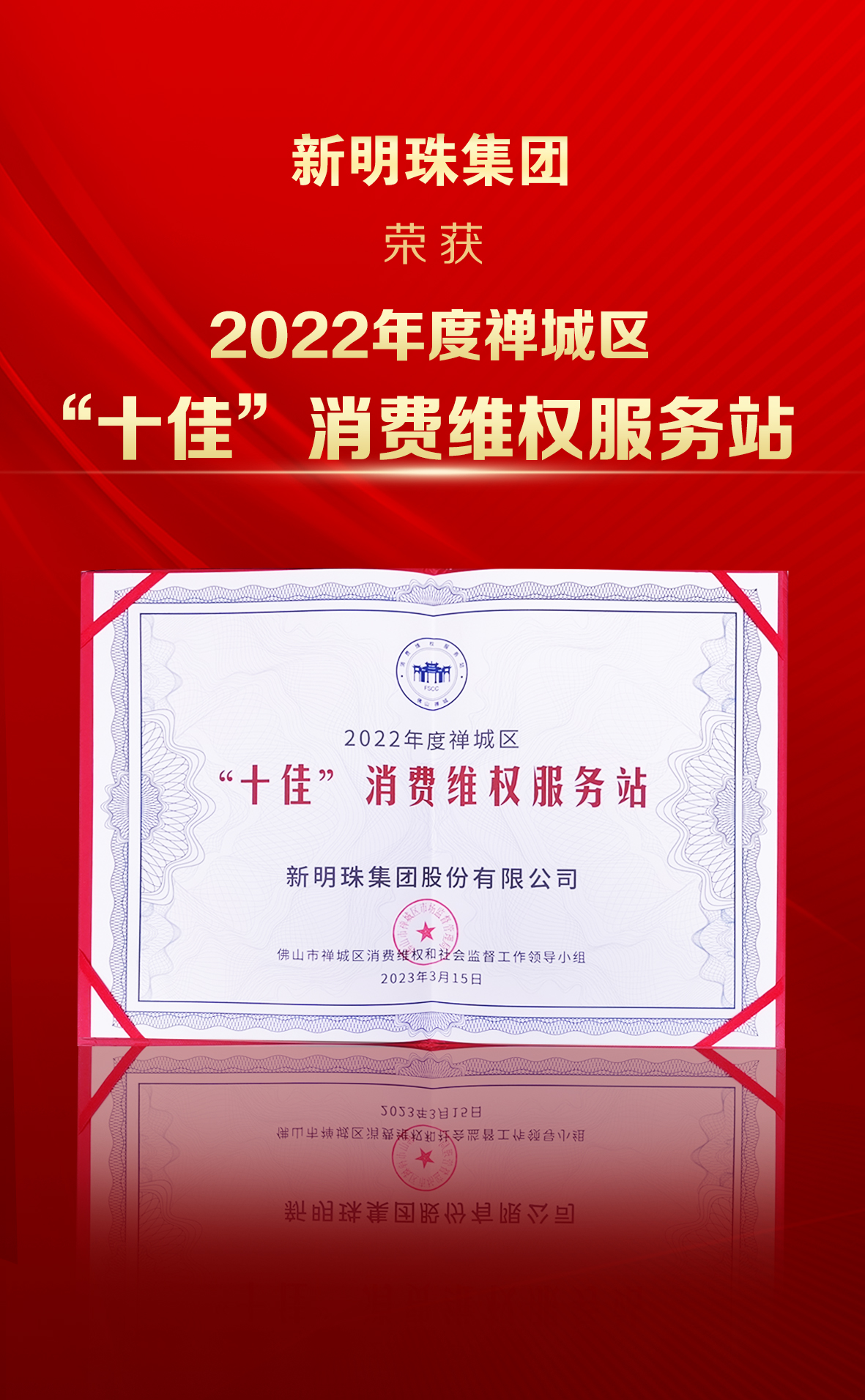 為充分發揮消費維權的先鋒模范作用,營造和諧的消費環境,助力禪城區高質量發展,活動上,主辦方同期公布2022年度“十佳”消費維權站名單,并對獲獎單位授予榮譽牌匾。新明珠集團憑借卓越的品牌實力、專業完善的產品服務獲評2022年度禪城區"十佳”消費維權服務站殊榮。