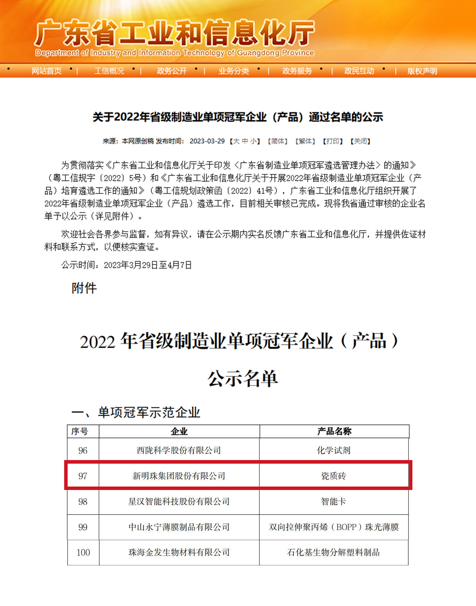 近日,廣東省工業和信息化廳發布《關于2022年省級制造業單項冠軍企業(產品)通過名單的公示》。新明珠集團憑借卓越的綜合實力成功入選2022年省級制造業“單項冠軍示范企業”榜單,成為廣東省唯一一個上榜的瓷磚制造企業。