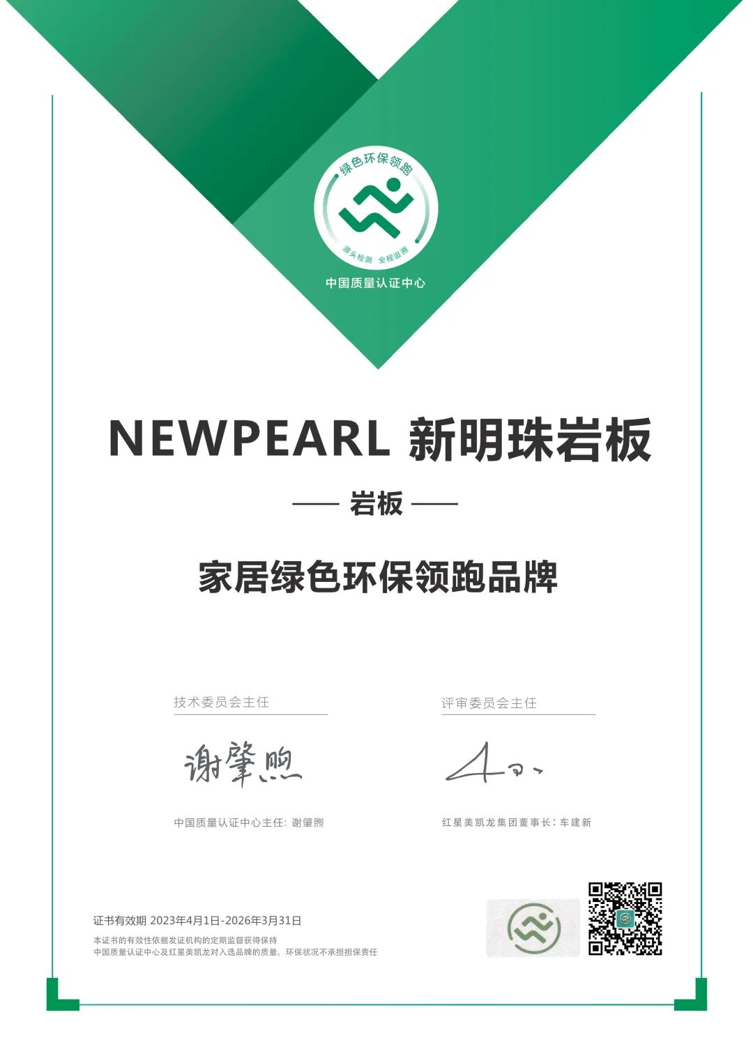 2023年4月20日,由紅星美凱龍與中國質量認證中心(簡稱CQC)聯合發布的“家居綠色環保領跑品牌”年度榜單重磅發布!與以往不同的是,今年的榜單進行了革新,其中,考慮到消費者對巖板家裝的審美升級,特別加入新趨勢品類巖板,新明珠巖板在眾多巖板品牌中脫穎而出,成功獲評“家居綠色環保領跑品牌”認證!