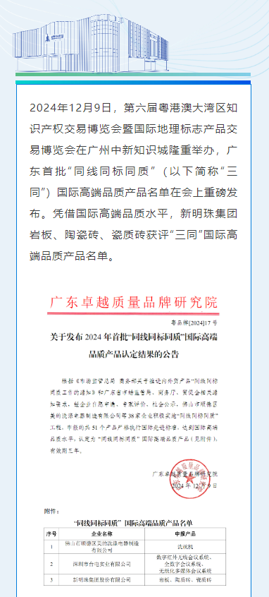 廣東首批!新明珠集團入選“三同”國際高端品質產品名單